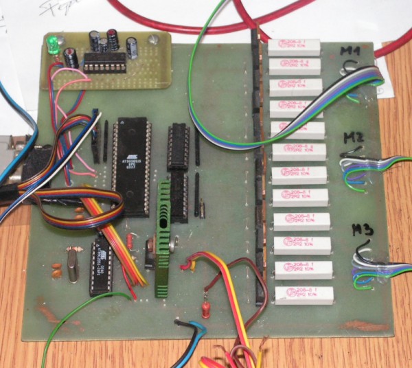 Tutaj możemy powrócić do prędkości silników krokowych, to że silnik ma opis 4,1V/1,1A nie oznacza że ma być zasilany egzotycznym napięciem 4,1V. Ograniczeniem jest tu prąd i sposób narastania go przy różnych napięciach. Moje silniki zasilane są metodą klasyczną, prostą ale mało efektywną. Ograniczenie i dopasowanie prądu realizowane jest poprzez dołączenie rezystora w szereg z cewką. Rozwiązaniem bardziej optymalnym jest sterowanie o podwyższonym napięciu /około 10 razy znamionowe/, z ograniczeniem prądowym realizowanym poprzez PWM - są nawet specjalizowane układy.