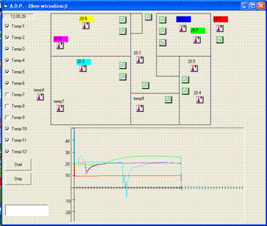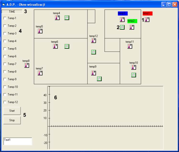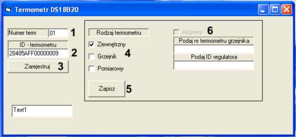 Pole 1 zostawiamy bez zmian, w pole 2 wpisujemy ID naszego DS18B20 i klikamy na klawisz 3 zarejestruj - jeżeli transmisja przebiegła poprawnie to w okienku gdzie pisze text1 zobaczymy końcówkę id + znacznik końca. Pola 4 i 6 zostawiamy na razie i klikamy na zapisz - wracamy do głównego okna programu. Możemy tą czynność powtórzyć dla innych termometrów klikając na kolejne ikonki termometrów - przy czym pierwsze 6 są zobrazowane na wykresie dodatkowo. Wracamy do głównego okna programu /okno wizualizacji / - i przy czwórce odznaczamy dodane termometry i naciskamy start. Powinien ruszyć zegar, co 10 s następuje odczyt z termometrów / pierwszy odczyt będzie miał wartość 85 stopni/ i rysowanie wykresu temperatury.