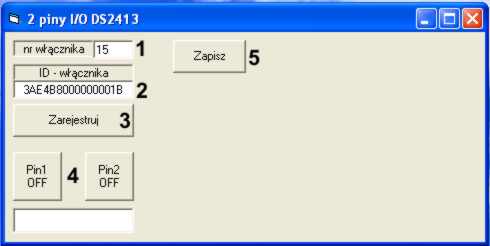 Jeżeli chcemy przetestować podłączony układ switch'a musimy go najpierw zarejestrować / podobnie jak DS18B20 / Uwaga - jeżeli sprawdzaliśmy termometry - trzeba nacisnąć STOP /zegar musi stać/ - następnie podwójne kliknięcie na symbolu przy "2" główne okno programu i powinno pojawić się okno poniżej